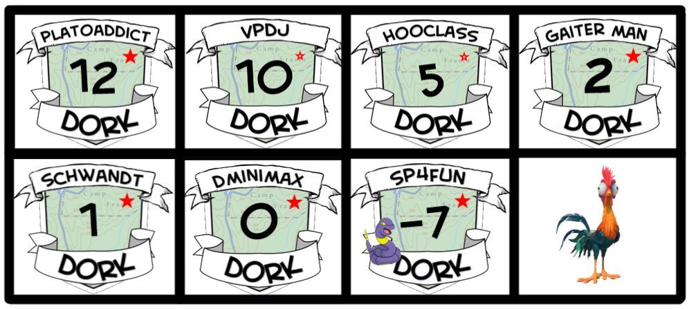 ZippyFinn: As I look back through the logs, I see that I’m slacking. The final awarding of points is as follows: