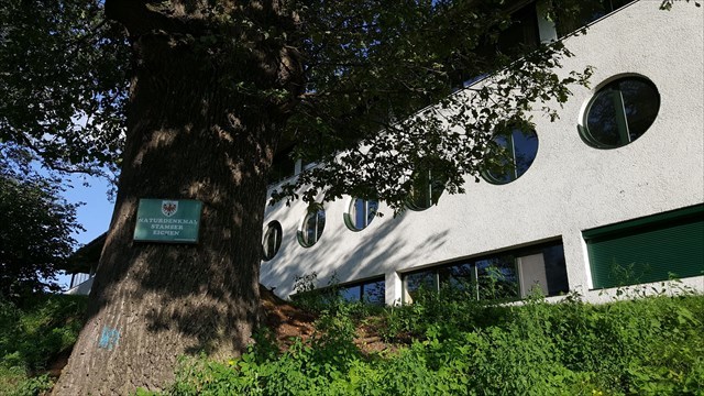 Das Schigymnasium gehört wie die Eichen zu Stam(b)s. Hier triffst du beides und kannst auf dem Weg hierher die Architektur sowie das Naturdenkmal bewundern.