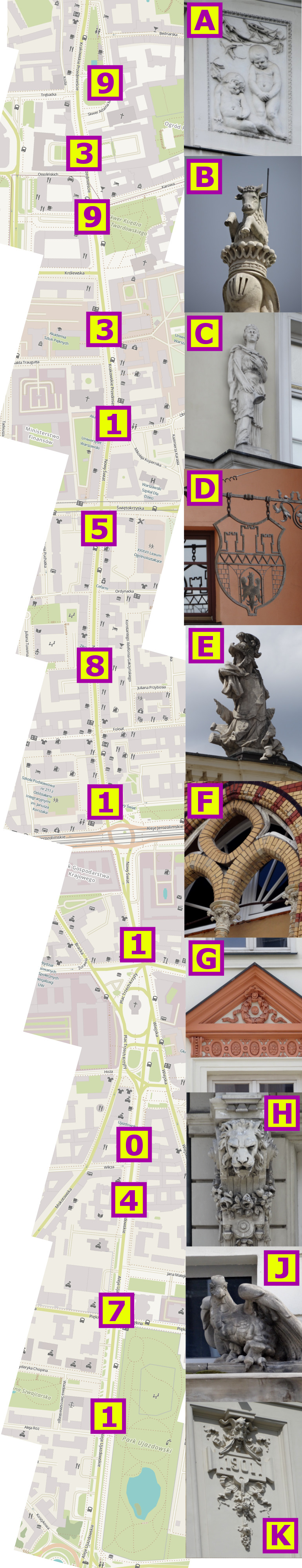 ENG – The task is simple – you go for a walk to the Royal Route! Below you can see 10 photos of the details hidden at the buildings along Krakowskie Przedmieście, Nowy Świat and Aleje Ujazdowskie, each of them is signed with a letter from A to K. Find these details in the Royal Route and match them with the locations marked on the map, where you can find digits in proper places. Match all the letters from the photos with all the digits from the map, and then insert the marks you gained in the formula at the end of the task. Some digits don't have any represenatation of the letters, so don't get confused! This is how you can count the coordinates of the final cache! GOOD LUCK!