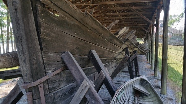 3. Holding the remains of the boat upright are a series of cradles. How many cradles are on the starboard side? Do not count the one support without a cradle on the starboard side and do not count the ones on the port side.