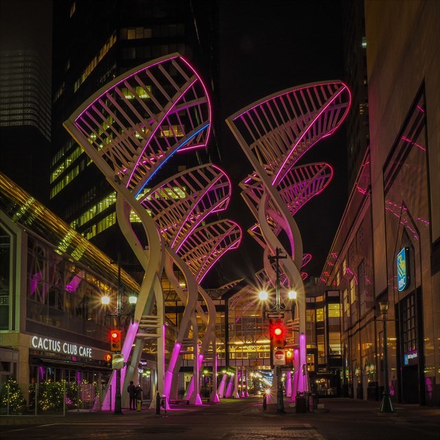While not part of the initial installation, the sculptures have since been outfitted with colour changing LED lights, which add to the street level vibrancy and are programmed for special events and occasions.