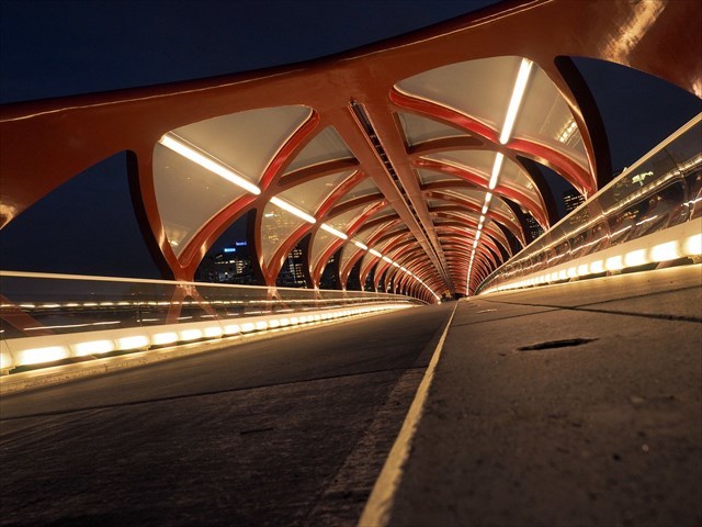 The Peace Bridge connects the southern Bow River pathway and downtown Calgary with the northern Bow River pathway and the community of Sunnyside. Opened in the spring of 2012, it’s one of the most controversial public infrastructure projects in Calgary, thanks to its cost, its proximity to other pedestrian bridges, the way the design was single-sourced and awarded to a foreign firm, for the defective welds that delayed completion by 18 months and for its on-going repairs and maintenance requirements thanks to thermal expansion problems as well as vandalism.