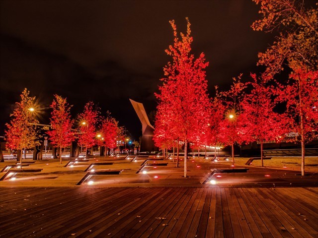 The Poppy Plaza project transformed an underused open space around a busy intersection at Memorial Drive and 10th Street N.W. into a dynamic public space. The design includes a folded wood deck that incorporates an original Memorial Drive poplar tree, provides seating, space for native plantings and is sheltered from the summer sun by a new grove of Aspen trees. A more sculptural element is the weathering steel wall that features backlit quotations from world leaders and citizens in Canada and around the world. The design uses lighting to stir emotion and evoke a sense of respect, awe and introspection tuned to memorialisation. Two illuminated sentinels across the river contribute to the experience. Poppy Plaza was ranked 4th in the Top 10 World Class Landscape Architecture Projects of 2014.