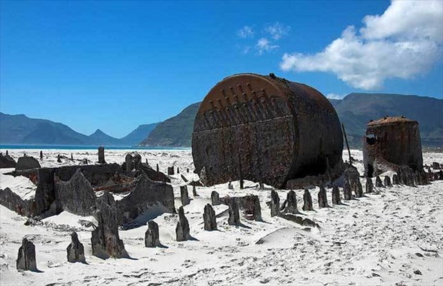 The wreck can be approached from either the Noordhoek or Kommetjie sides of the beach. From the North, the walk is about 35-40 min. Approaching from the South is a shorter walk, but may involve wading across the stream that drains the wetlands if there has been recent rain.