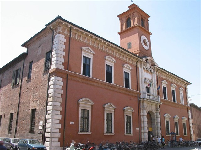 Palazzo Paradiso houses the Historical Library of Ferrara. It was built in 1391 by Alberto V d'Este on the occasion of his marriage to Giovanna de Roberti and was decorated with scenes of court life and motifs from chivalric novels. In 1801 the remains of Ludovico Ariosto were transferred from the Church of St. Benedict (N44°50.583, E011°36.893) to the library, together with the funerary monument in his honor.