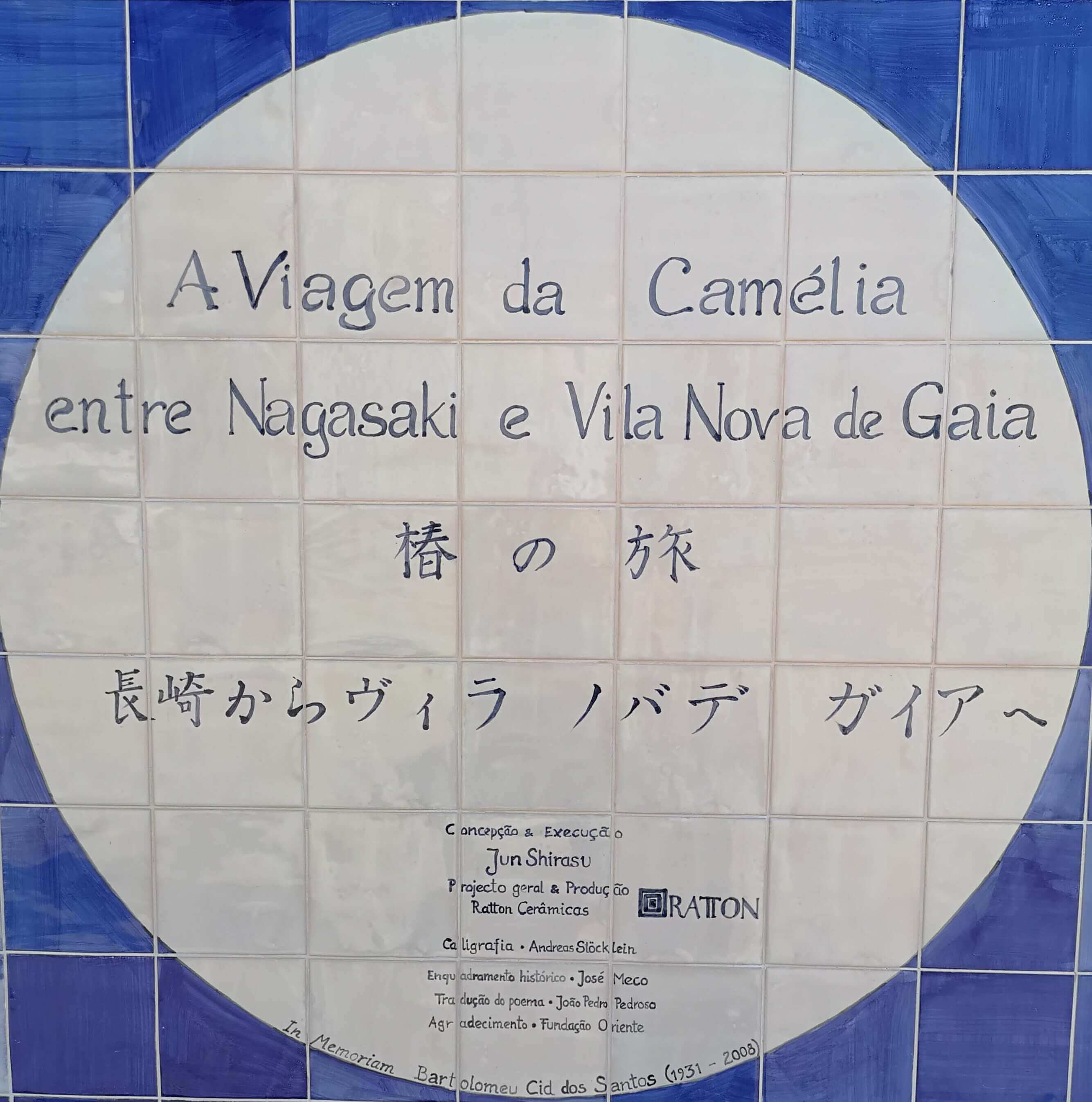 "A Viagem da Camélia" is a tile mural created by the Japanese painter Jun Shirasu, which is about 1 meter tall and 20 meters wide. The painter spent 3 months in an artistic residence of the Oficina Ratton, in Arrábida, creating it. This panel shows in a visual narrative, how this plant (the camellia) came from Japan to Portugal and, also, the crossed history of both countries in the centuries XVI and XVII.