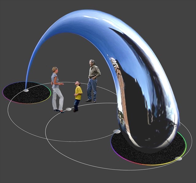 Near the posted coordinates you will find an art sculpture currently titled "UNTITLED" that will soon be named. The 5520 pound sculpture is 30' long, tapers from practically nothing at its narrow end, arching gracefully to a stately height of 15' 4" before reaching 7' 6"at its widest part on the other end. It is made of stainless steel polished to a mirror finish allowing one to see a warped reflection of themselves in it.