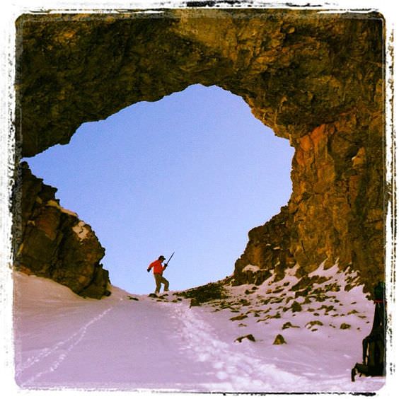 There are no restrictions to driving up to this parking lot anytime of the year and taking a look. On a busy Saturday or Sunday in winter, the Sunshine parking crew may try to guide you into a parking spot but have no fear you can drive on and temporarily stop at the coordinates until you find the cache. The Goat's eye is a natural arch which was formed by water. It is located on Eagle mountain.