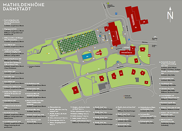 Nun begebt Euch zur Mathildenhöhe. Ihr beginnt bei Nummer 33, dem Gartenpavillion "Schwanentempel".