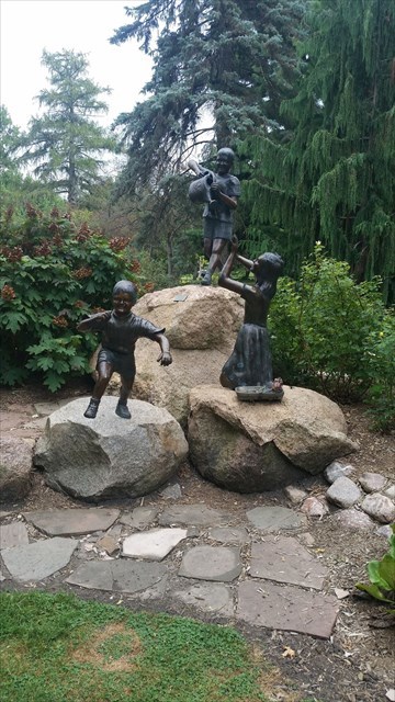 The Children's Sculpture Garden, established 1999, is a colorful yet peaceful setting for Amber, Adam, and Cole: Grammy's Flower Children by Ted McElhiney. There is also a giant Praying Mantis nearby, a sculpture donated by Dick Southwick.