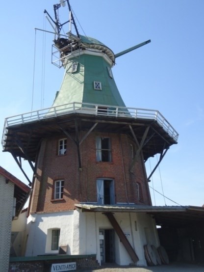 Die Bockwindmühle ist 24 m hoch. Früher reetgedeckt ist sie heute mit grüngestrichenem Zinkblech verkleidet.