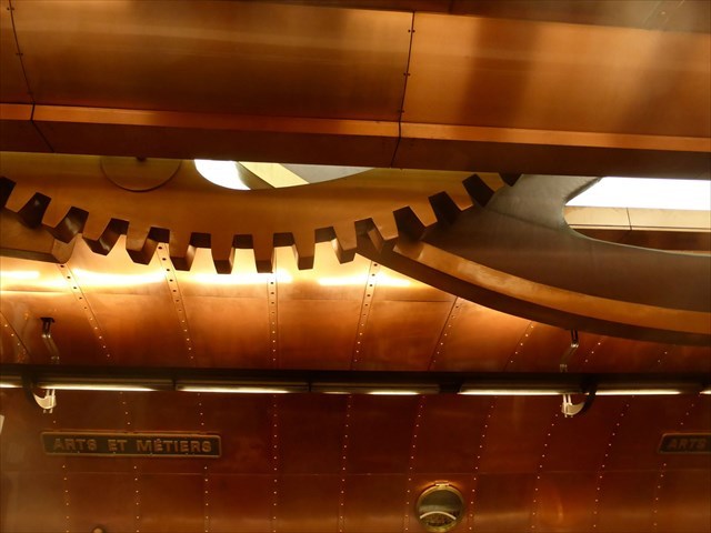 The station is entirely covered with copper plates attached to each other, and not the usual tiles of earthenware. They have been set up during the bicentennial ceremonies of the National Conservatory of Arts and Crafts. The traveler is immersed inside a huge machine, a kind of underground Nautilus evoking the atmosphere of Jules Verne's "Twenty Thousand Leagues Under the Sea", with steampunk style. On the station ceiling, a series of great wheels evokes the museum of arts and crafts. The copper, only used material, evokes the technical and industrial universe.