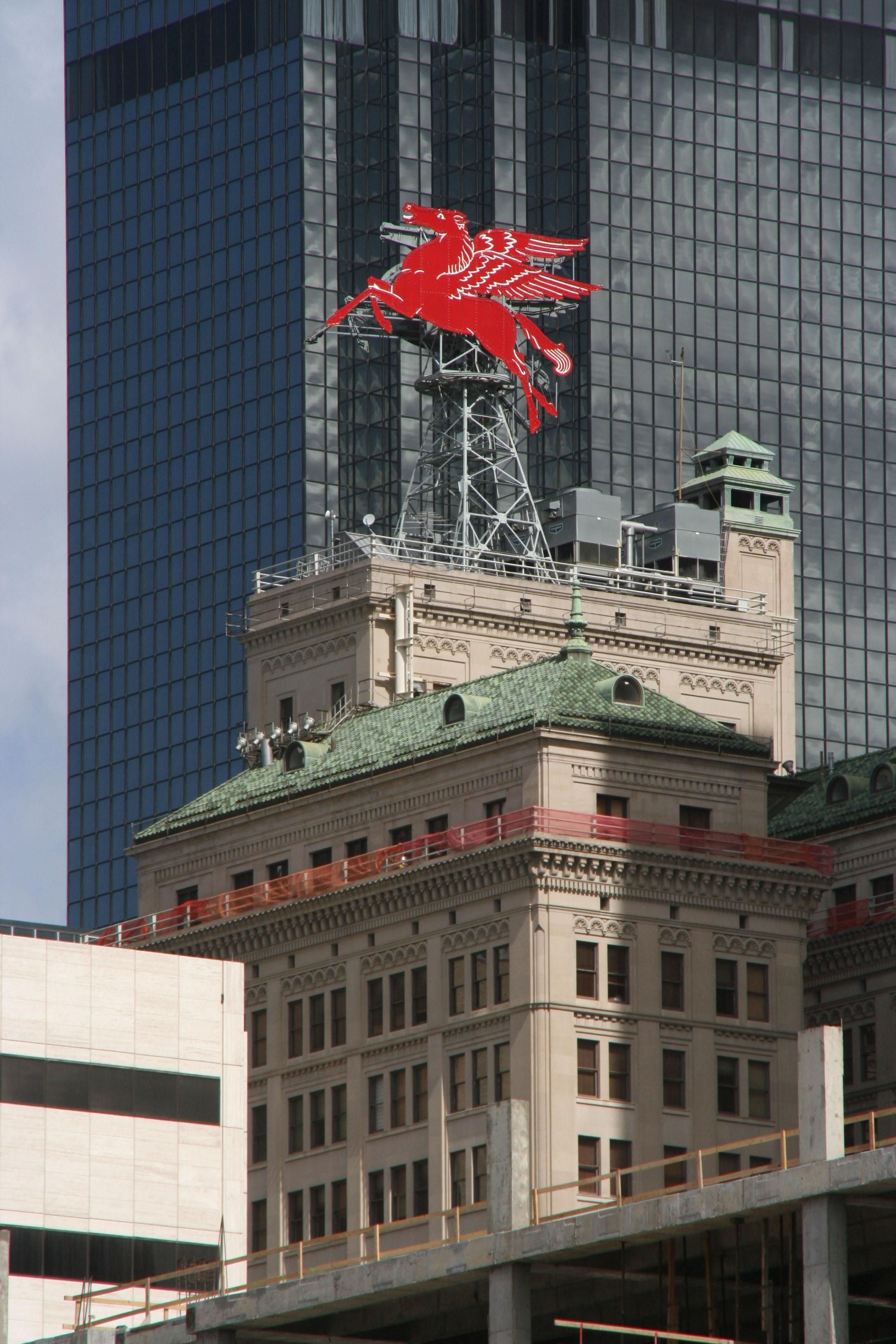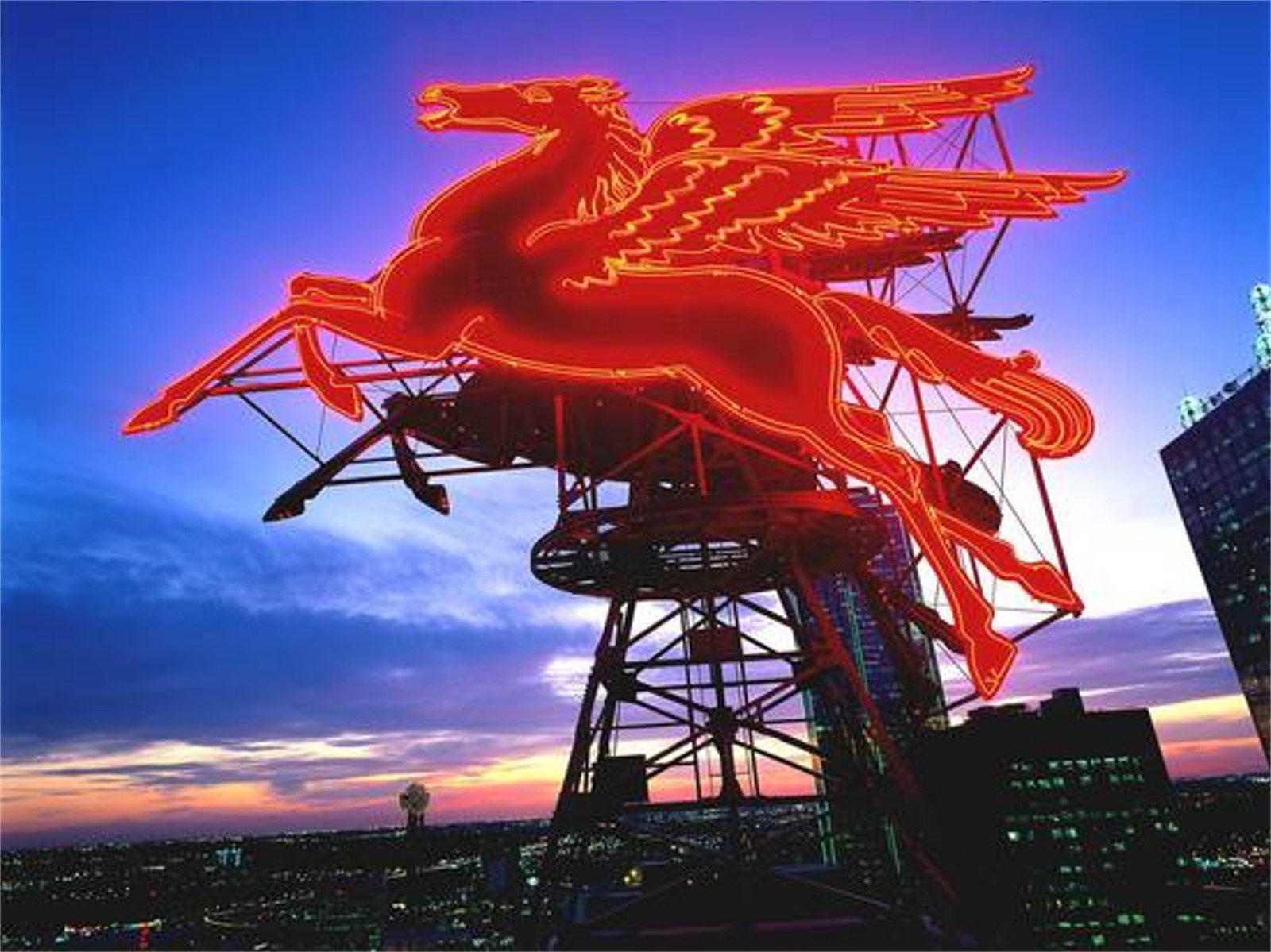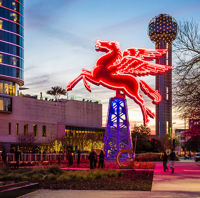 The Magnolia Petroleum Building was built in downtown Dallas in 1921. The original Pegasus was built of porcelain and neon by Texlite sign company for the Magnolia Oil Company to celebrate the American Petroleum Institute's annual meeting, held in Dallas for the first time in 1934.