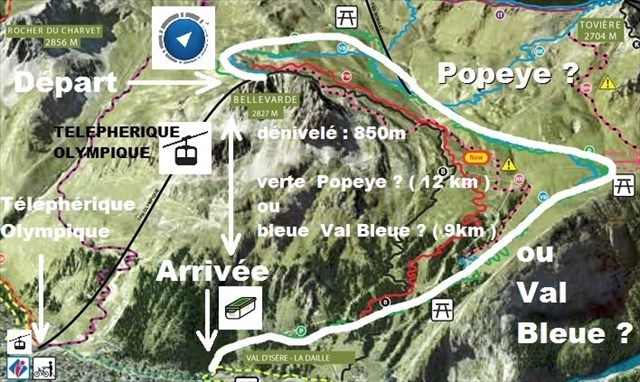 Départ du haut du téléphérique de l'Olympique. Fin de l'aventure après 9km ou 12km de descente et 850m de dénivelé plus bas ( waypoint FD7BJP9 - qu'il faut visualiser avant de partir ), au niveau du panneau n°2 ( en 2019 ) de la Piste Popeye. Il ne faut donc pas faire les 300 derniers mètres de la piste !