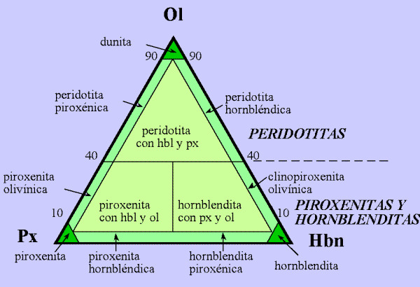 Rocas ultramáficas. Roca con más de 90 % de silicatos oscuros. Aunque son raras en la superficie de la Tierra, se cree que las peridotitas son el constituyente principal del manto superior