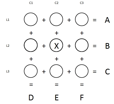 Dans la grille ci-dessous, remplacez A à X par leurs valeurs, puis complétez les cercles pour que les chiffres de 1 à 9 s'y retrouvent tous.