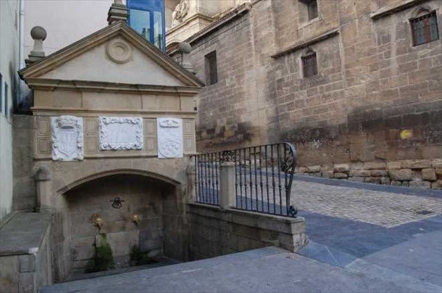 En una esquina de la plaza encontramos la Fuente de los Peregrinos, construida en piedra, y formada por un arco rebajado entre dos pilares, friso y frontón. El año 1675 puede ser el de su reconstrucción, puesto que la obra es más antigua. Se la conoce popularmente con varias denominaciones “Fuente de Santiago, del Peregrino o del Camino”.