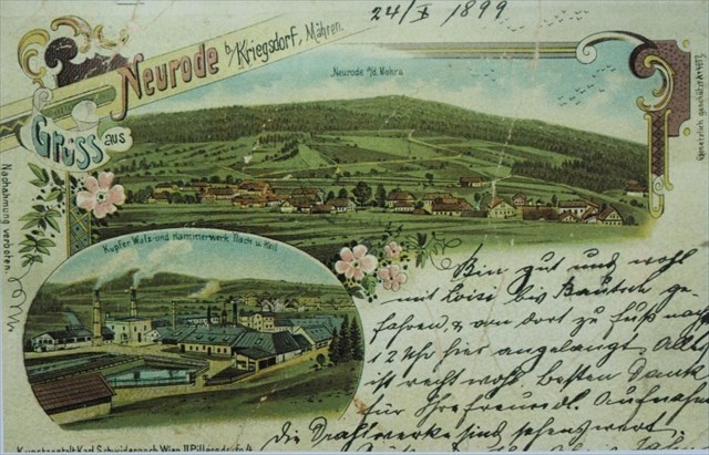 V materiálech máme několik fotografií poskytnutých ze soukromé sbírky Pavla Rapušáka (Klub Za starý Bruntál), kterému tímto děkujeme za pomoc a za jejich zapůjčení i svolení je zveřejnit a za další postrčení k získání dalších zajímavých informací k tomuto místu. Škoda jen, že se místu nedostalo více veřejně známé oslavy a úcty. Proto aspoň chceme věnovat této nedochované technické památce tuto keš a rozšířit informaci o její existenci mezi větší skupinu lidí, aby nebyla tato památka zcela zapomenuta a opomíjená jako doposud. Mezi vzácnými fotografiemi je pohlednice od W. Schwidernocha z Vídně z konce předminulého století, která je určitě nejzajímavější, protože se na ní nachází i kresba měděného hamru. Ten se mihne ještě na další pohlednici. Tímto se uzavírá zdroj z dostupných dobových pohledů na hamr a okolí. Z novodobé historie místa z poloviny 20.století, kde dříve v blízkosti hamru protékala řeka Moravice a byl zde i splav, bylo vynikající místo na stanové tábory. Na další pohlednici je tábor Sokola Vyškov, takže někde z roku 1948. Možná i více Bruntaláků dříve narozených osobně na tomto místě zažili své první tábory, které se datují kolem roku 1951 do roku 1956. Pak se tábor přestěhoval do lesů na tzv. Mydláčkovou paseku. Foto splavu před továrnou ani kapli u hřbitova se nám bohužel nepodařilo z historických pramenů sehnat.
