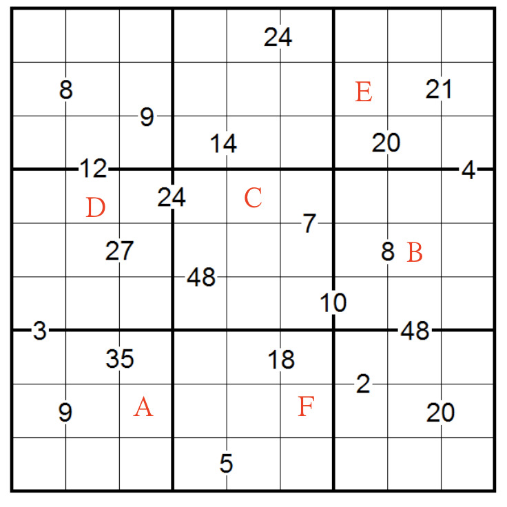 在空格内填入数字1~9,使得每行、每列及每个区域内数字均不重复,提示数表示两侧格子内数字的乘积。