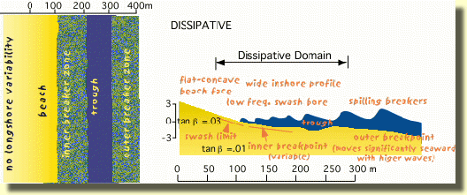Les plages dissipatives sont caractérisées comme des plages avec de fortes vagues et une vaste zone de surf (entre 300 et 500 mètres) avec une faible pente et la largeur.