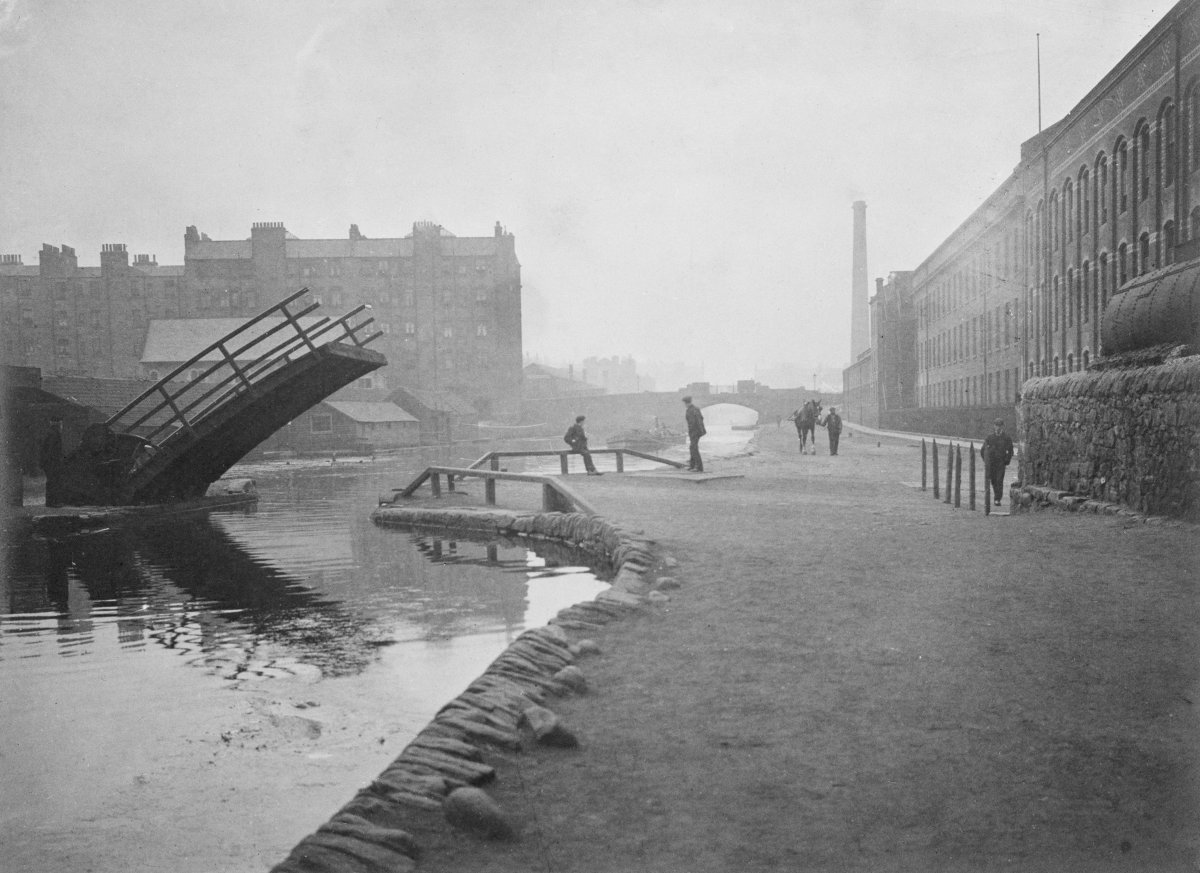 Due to a decline in canal traffic, the Port Hamilton and Port Hopetoun basins were closed and filled in by 1922 and, as the canal then ended south of Fountainbridge, the lift bridge was dismantled in November 1922 and later re-erected at its present site replacing an earlier wooden lift bridge shown in the below image.