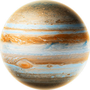 Jupiter ist der grösste Planet des Sonnensystems und besteht aus Gas. Er hat etwa 2,5 mal so viel Masse, wie die restlichen Planeten zusammen. Auf ihm tobt der grösste Sturm des Sonnensystems. Die vier grössten Monde (Io, Europa, Ganymed, Kallisto) hat Galileo Galilei mit einem einfachen Fernrohr entdeckt. Der grösste davon, Ganymed, ist ein wenig grösser als Merkur.