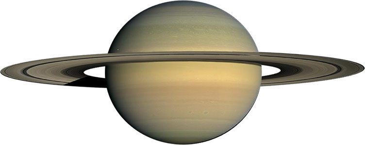 Saturn ist ebenso ein Gasplanet mit sehr prägnanten Ringen. Er ist der äusserste Planet des Sonnensystems, der mit blossem Auge am Nachthimmel gesehen werden kann. Sein grösster Mond ist Titan, der grösser ist als Merkur.