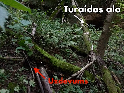Aunapieres ala - Krimuldā, Gaujas labā pamatkrasta nogāzē, Piķenes kraujā. Burta D uzdevums - Fotogrāfija uzņemta stāvot tieši zem alas. Cik lieli koki aug rindā, fotogrāfijas aizkrāsotajā daļā?