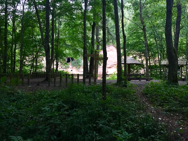 Peter's cave - Got such a name, because during the Northern War, peasant Peter and his family have been hiding here. Task of letter B - To the right of the cave, screws are screwed into one of the wooden platform supports. • = • •• = – Hint: Morse code
