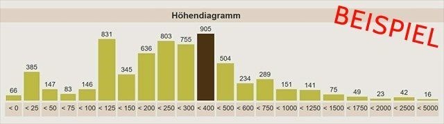 Bei project-gc.com findet man in der Profilstatistik ein Höhendiagramm, in dem die Cache-Funde nach Höhe über dem Meeresspiegel gestaffelt sind. Es besteht aus 21 Balken, die jeweils einen Höhen-Bereich darstellen. Es beginnt bei "unter 0 m" und endet bei "über 2500 m".