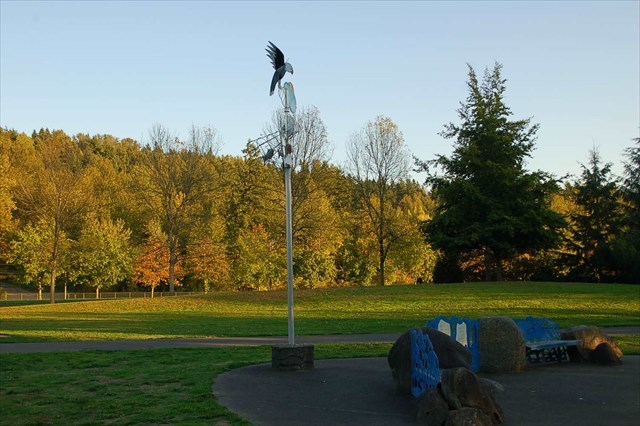 This beautiful piece of art was created by Michele Van Slyke in 1993 using concrete, stone, aluminum, steel, cedar and enamel paint. She was born and raised in France and studied at the Sorbonne in Paris and the University of Heidelberg in Germany before finally settling on Bainbridge Island in 1971. This piece celebrates the White River as an important fishing ground for the Lushootseed people, the benches and wind sculpture depict the annual salmon migration, and the nets and weirs used by our region's Native American people.