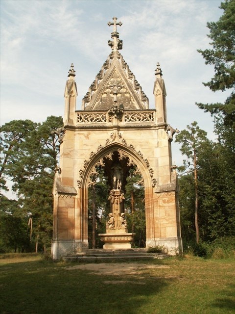 Pseudogotická kaple byla vybudována knížetem Aloisem II. z pískovcových kvádrů, dopravených po železnici z Vídně a Eggenburgu, jako místo pro konání mší za úspěch lovu zvěře. Její dominantu tvoří socha svatého Huberta, patrona myslivců a střelců, ale také optiků a matematiků. Kaple je poslední vybudovanou stavbou Lichtenštejnů v Lednicko-valtickém areálu.
