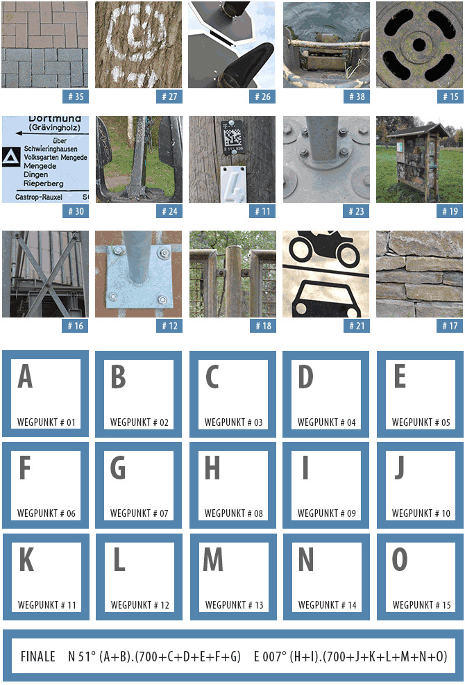 An den Koordinaten des Geocaches angekommen, wählt ihr in der App oder dem GPS Wegpunkt #01 als Ziel aus und begebt Euch dort hin. Dort haltet ihr Ausschau nach einem Bildausschnitt aus der Bilderliste. Habt ihr ihn entdeckt, notiert ihr die dazugehörige Zahl (unten rechts unter dem Bild) in die Tabelle bei Wegpunkt #01.