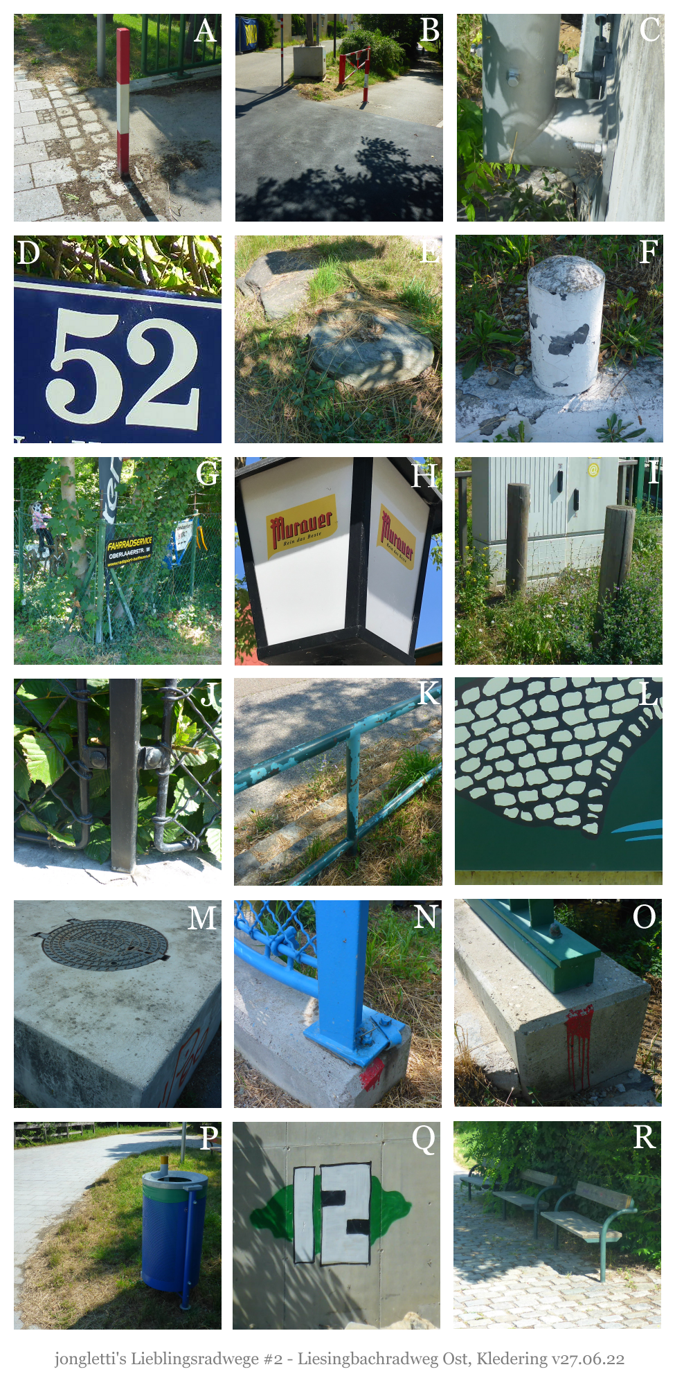 Ganz einfach, die Stationen entsprechen den grünen Radschildern. Folge dem gut ausgeschilderten Radweg und halte bei jedem grünen Radschild (es gibt mehrere Arten davon, siehe Fotos oben) Ausschau nach einem der Bilder, beginnend gleich hier bei dem ersten Schild vor dem Du stehst. Die gesuchten Objekte befinden sich meist in unmittelbarer Nähe des Schildes bzw. in Sichtweite. Aufgrund der Platzierung der Schilder ist nicht bei jedem Radschild ein Bild zu finden, aber bei den meisten. Das nächste Schild bzw. Bild kann sehr rasch auf das vorige folgen, es können aber auch längere Distanzen zwischen zwei Bildern liegen.