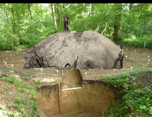 Observez sur ce site un bombement circulaire d’une dizaine de mètres de diamètre. Il s’agit d’une ancienne charbonnière ou « aire de faulde » où était produit du charbon de bois jusqu’il y a environ 200 ans, par la technique de la meule forestière (voir la galerie photos). Le bois était empilé en meule que l’on couvrait de feuilles et végétations diverses puis d’une couche de terre. La meule était alors mise à feu par une cheminée centrale. Le feu couvait ainsi dans une atmosphère pauvre en oxygène (processus appelé « pyrolyse ») durant plusieurs jours sous la surveillance, jour et nuit, de charbonniers. Une fois la cuisson terminée et après refroidissement de la meule, la couverture de terre était retirée et le charbon de bois récolté avec des râteaux. Il restait ainsi sur place un mélange de terre et de fragments et poussière de charbon de bois, le frasil. Celui-ci était réutilisé pour la couverture des meules qui se succédaient dans le temps au même endroit. C’est ainsi que l’on observe actuellement sur ce site une couche (un « horizon ») superficielle noirâtre d’une quarantaine de centimètres au centre de l’aire de faulde. On y reconnaît encore des fragments de charbon de bois.
