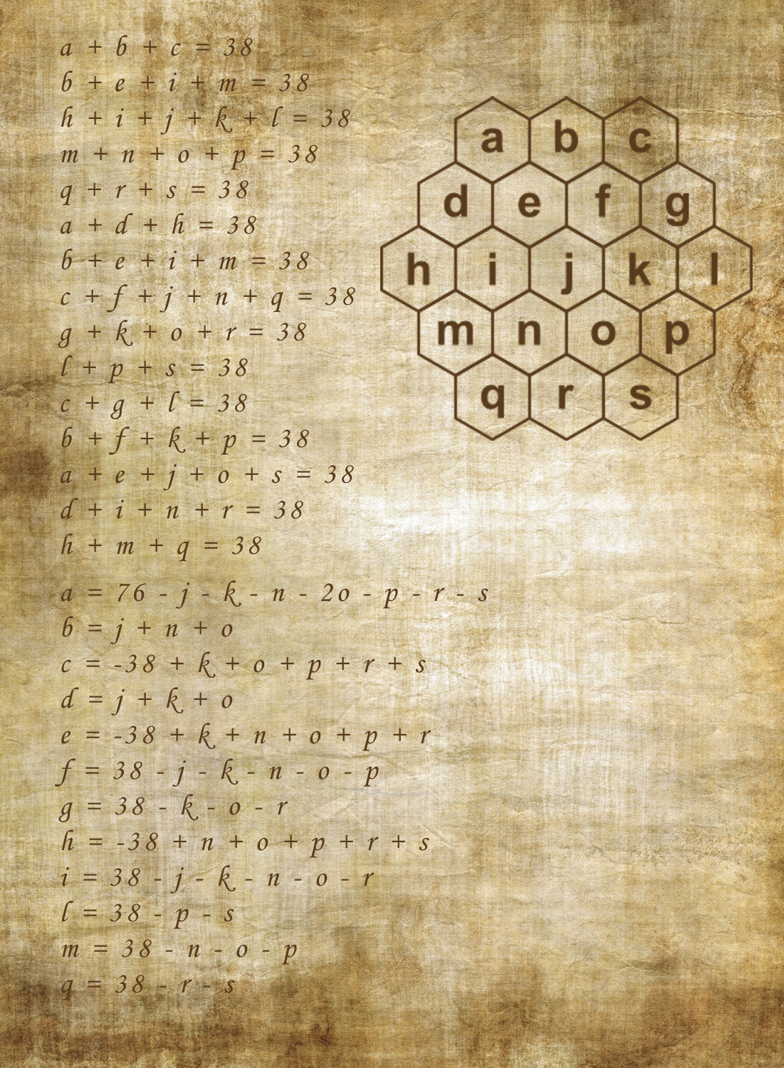 According to Aristotle, the numbers 1-19 can be arranged into a hexagon. Aristotle's worksheet shows that each of the 15 rows in the hexagon have a unique feature in that each row adds up to 38.