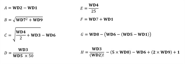De 8 letters (A t/m H) kan je achterhalen doormiddel van deze formules: