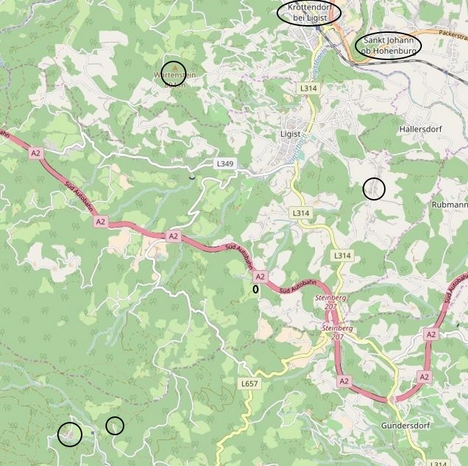 Das grobe Gebiet in dem die Caches der 81 Matrix liegen ist auf der Karte unten dargestellt. Es wird im Norden von Krottendorf-Gaisfeld und St. Johann-Köppling begrenzt, beinhaltet im Nord-Westen den Wartenstein und im Süd-Westen geht es fast bis zum Klugbauer und der Hahnhofhütte. Der am weitesten östlich gelegene Ort ist Grabenwarth