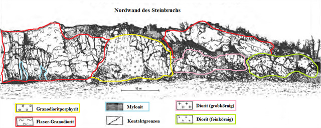 1 Dieser Kontaktbereich zwischen Granodioritporphyrit und Nebengestein ist gegenwärtig nur im Steinbruch Meßbach aufgeschlossen.