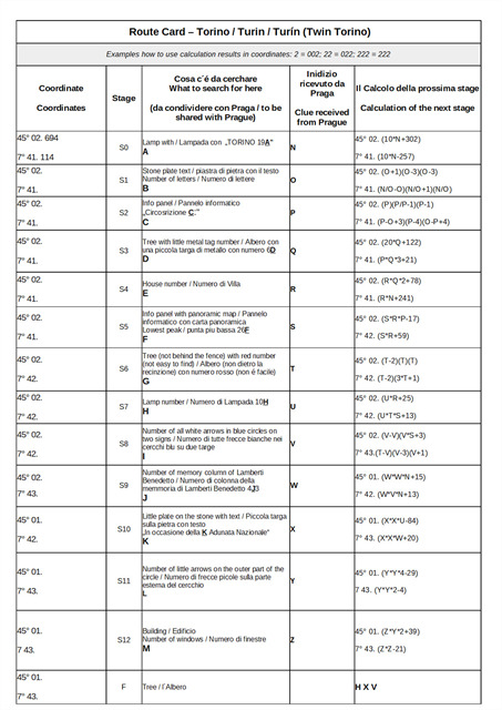 Original coordinates of Prague cache "Twin Praha" will provide value A. Value A is needed for calculation of Stage 1 of the cache "Twin Torino" in Turin. Similarly original coordinates of Turin cache "Twin Torino" gives figure N, which is required for calculation of Stage 1 "Twin Praha" cache in Prague. And so on, until you reach the final stage. Both teams should be collaborating and should be connected to share values (figures) via sms or WhatsApp or similar way.
