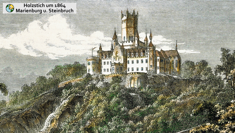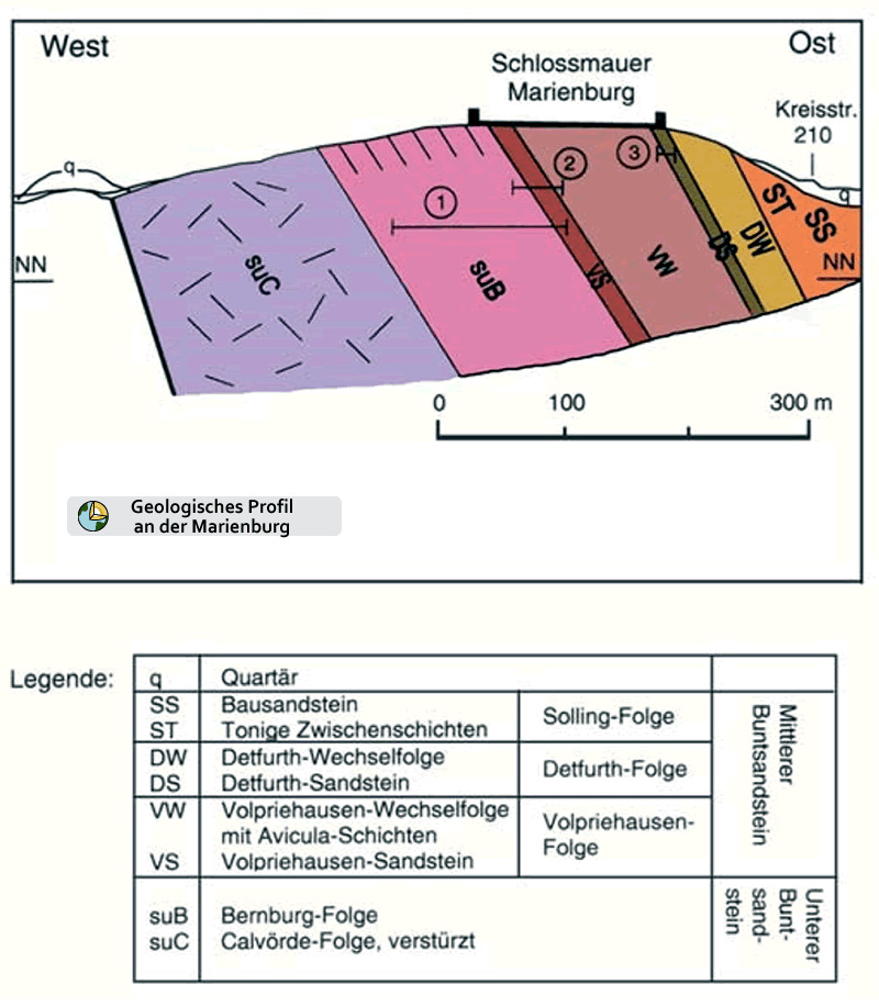 Die Kuppe des Schlossbergs ist durch seine exponierte Lage am Nordrand der deutschen Mittelgebirge sowie das weithin sichtbare im neogotischen Stil erbaute Schloss Marienburg gekennzeichnet. Die ehemaligen Steinbrüche südlich der Schlossmauer stellen zusammen mit den künstlichen Felsanschnitten an der unterhalb verlaufenden Kreisstraße K 209/505 die nördlichsten Buntsandstein-Aufschlüsse im Weser-Leine-Bergland. Zur Zeit des Buntsandsteins (Untere Trias: vor etwa 250 Millionen Jahren) lag Deutschland in einem semiariden Klimagürtel. Die an der Marienburg aufgeschlossenen Ablagerungen dieser Epoche bestehen im Wesentlichen aus rotbraunen Sandsteinen und Tonsteinen sowie den charakteristischen oolithischen Kalksteinen („Rogensteine“).