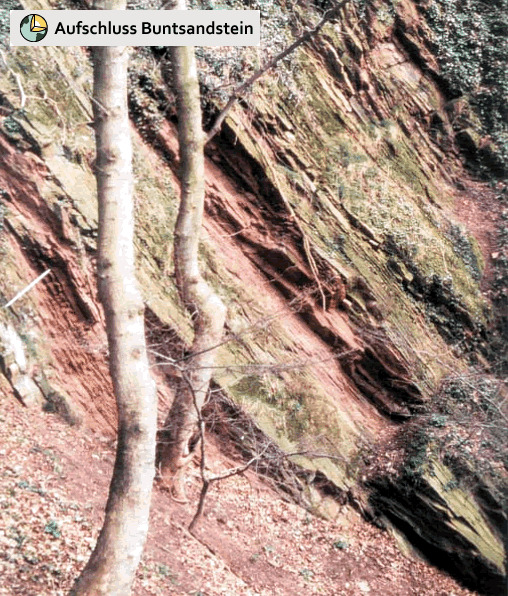 Auf deinem Wanderweg wirst du sicherlich einige merkwürdig anmutende Aufschlüsse aus der Zeit des Unteren Buntsandstein am Hang des Marienberges entdecken können. Eine davon ist sehr auffällig!