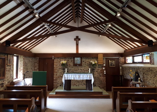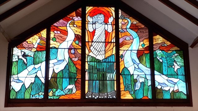 Dedicated to St peter, the glass was designed by a parishioner. Smaller stained glass panels are sited on the east wall and were also made by a local couple. They commemorate the lost and the dead. The Stations of the Cross can be seen on the walls. They were made in Italy and shipped over to adorn the walls.