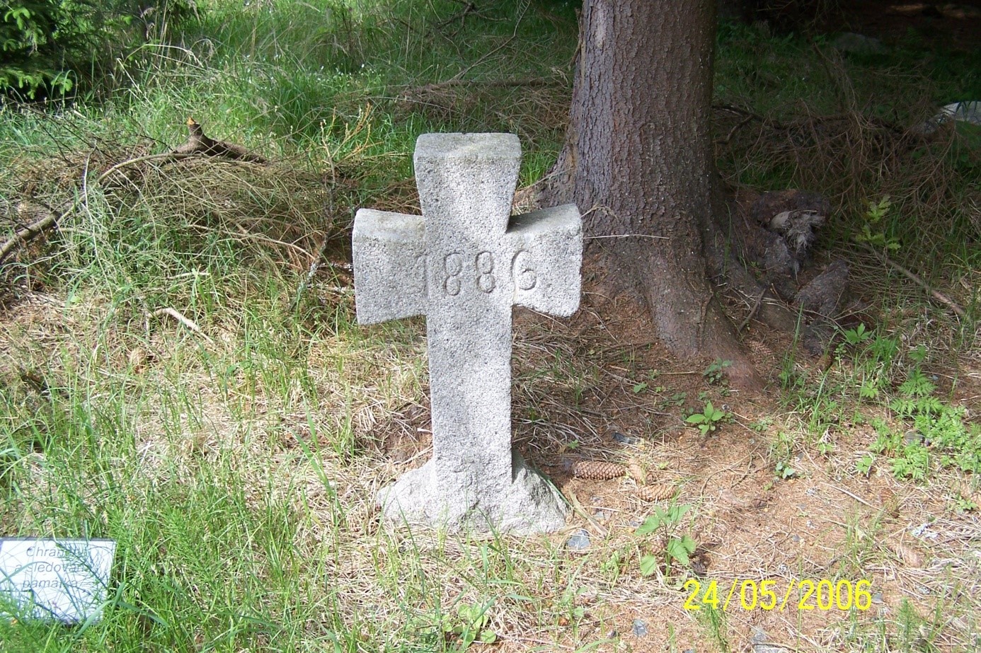 •žulový latinský kříž s rozšiřujícími se rameny a hlavou, noha v zemi přechází do rozšiřujícío se soklu, přes břevno je vryp letopočtu 1886