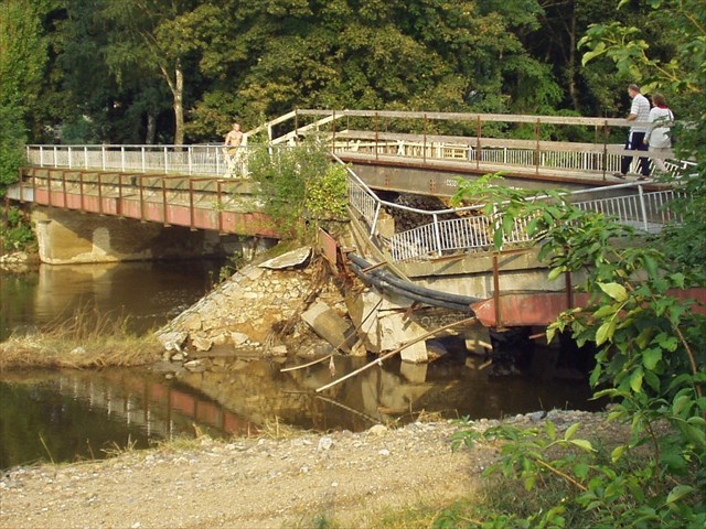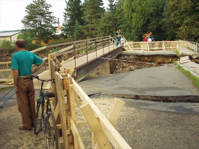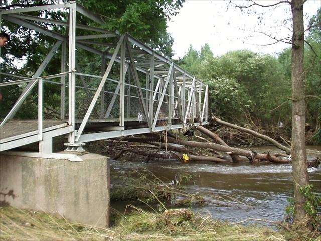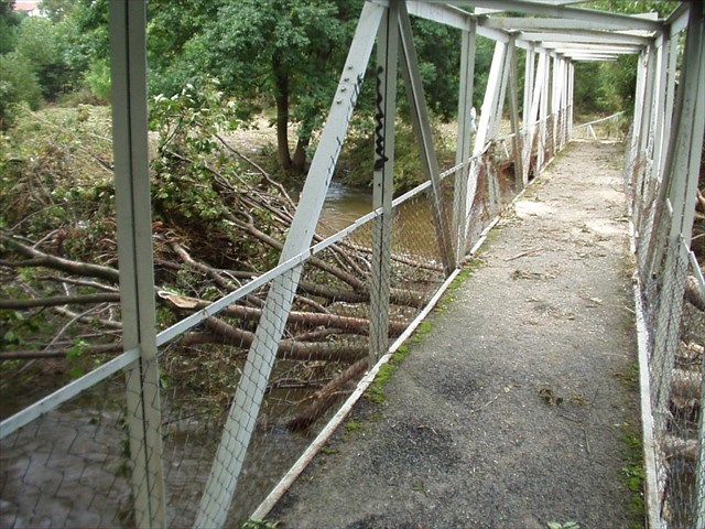 | Na fotkách si můžete prohlédnout, jak se někdejší most na výchozích souřadnicích a jedna lávka opodál popasovaly v roce 2002 s opravdu velkou vodou... S luštěním vám to sice nijak nepomůže, ale prý tu má být také nějaká zajímavost :-) |