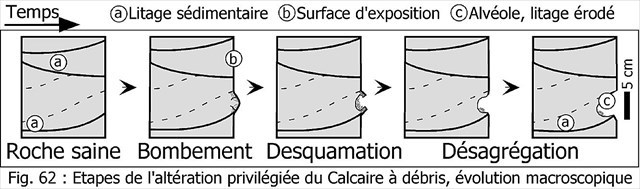 La désagrégation granulaire du Calcaire à débris et la desquamation sont en partie provoquées par une microfissuration parallèle à la surface du bloc. La désagrégation du Calcaire à débris par microfissuration produit finalement une poudre résiduelle qui se répand au fond des alvéoles et sur le sol. Ce calcaire totalement dégradé est composé de fragments de roche avec des éléments encore cimentés et d’éléments totalement individualisés.