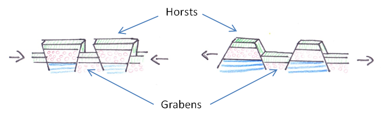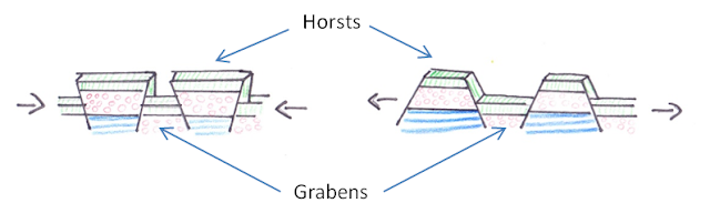 In geology, horst and graben refer to regions that lie between normal faults and are either higher or lower than the area beyond the faults. A horst represents a block pushed upward relative to the blocks on either side by the faulting, and a graben is a block generally long compared to its width that has been lowered relative to the blocks on either side due to the faulting. Horst and graben are formed when normal fault of opposite dip occur in pair with parallel strike lines. Horst and graben are always formed together. Graben are usually represented by low-lying areas such as rifts and river valleys whereas horsts represent the ridges between or on either side of these valleys.