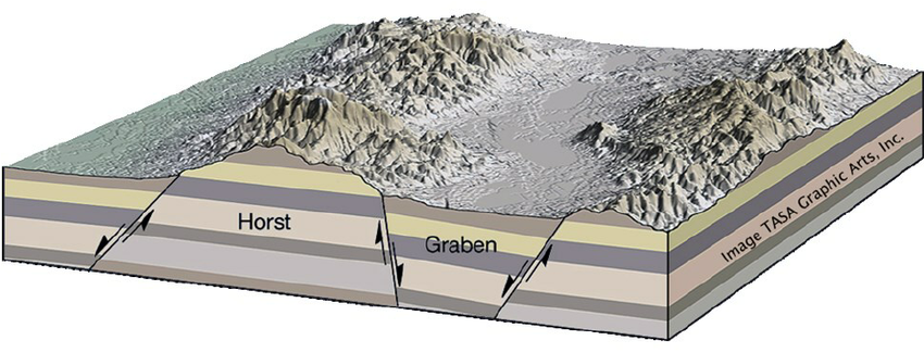 En géologie, horst et graben se réfèrent à des régions qui se situent entre des failles normales et qui sont plus hautes ou plus basses que la zone au-delà des failles. Un horst représente un bloc poussé vers le haut par rapport aux blocs de chaque côté par le fauchage, et un graben est un bloc généralement long comparé à sa largeur qui a été abaissée par rapport aux blocs de chaque côté en raison de la faille. Horst et graben sont formés quand le défaut normal de dip opposé se produit en paire avec des lignes de grève parallèles. Horst et graben sont toujours formés ensemble. Les Graben sont généralement représentés par des zones basses telles que les failles et les vallées fluviales, alors que les Horsts représentent les crêtes entre ou de chaque côté de ces vallées.´