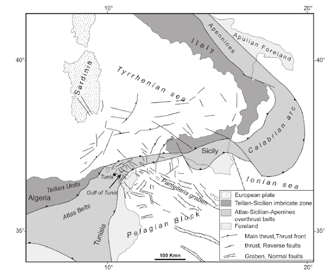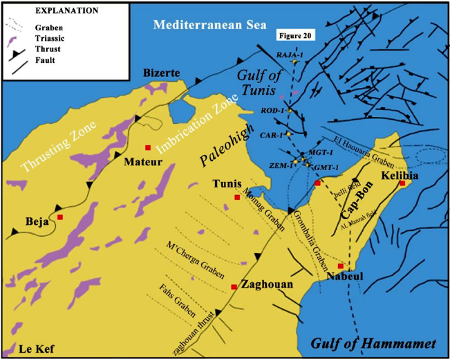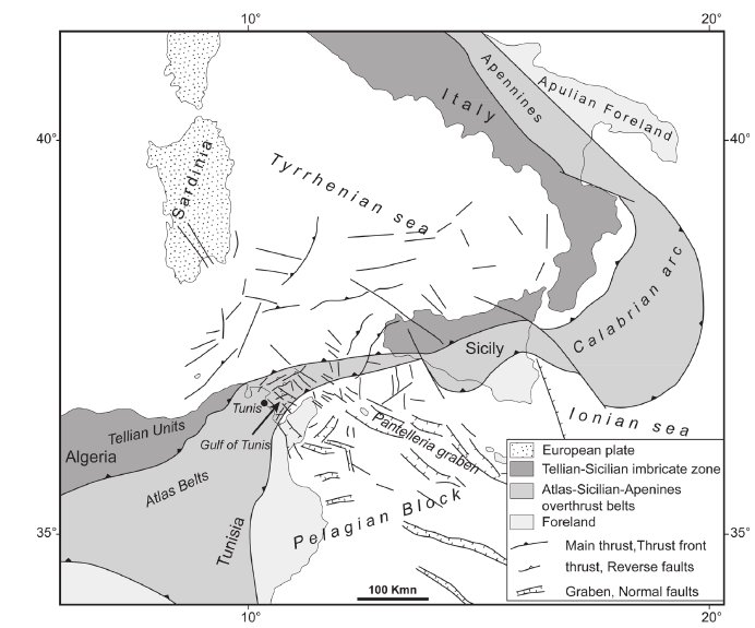 O Golfo de Túnis está localizado no nordeste da Tunísia (Fig. 1), a oeste do segmento siciliano do Orogen de Apenninic-Maghrebian. Os estratos sob o Golfo de Túnis constituem uma bacia offshore que se desenvolveu durante a colisão Neogene África-Europa (Dart et al., 1993; Lentini et al., 1996; Catalano et al., 2011).