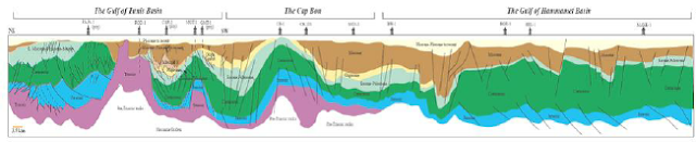 Figure 20. NW-SE regional seismic section: Gulf of Tunis, Cap Bon peninsula and Gulf of Hammamet domains showing structural styles.